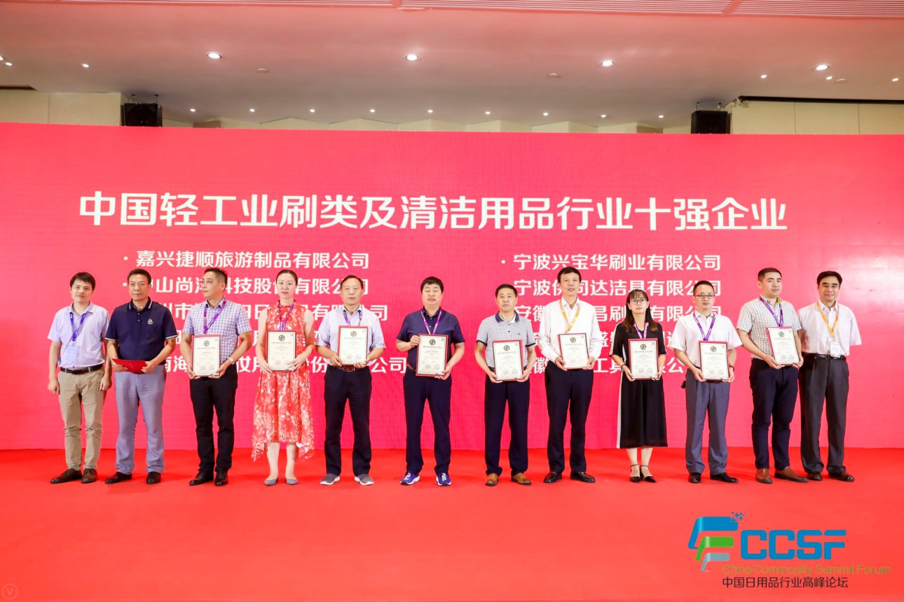 2018年7月8-10日 ,主題為“新時代 新消費 新機遇”中國輕工業(yè)十強企業(yè)高峰論壇在廣州召開,我司李愛良董事長參加了此次高峰論壇會議。會議期間,經(jīng)中國輕工業(yè)聯(lián)合會與中國日用雜品工業(yè)協(xié)會聯(lián)合認定,寧波伊司達潔具有限公司榮獲“中國輕工業(yè)刷類及清潔用品行業(yè)十強企業(yè)”榮譽稱號。