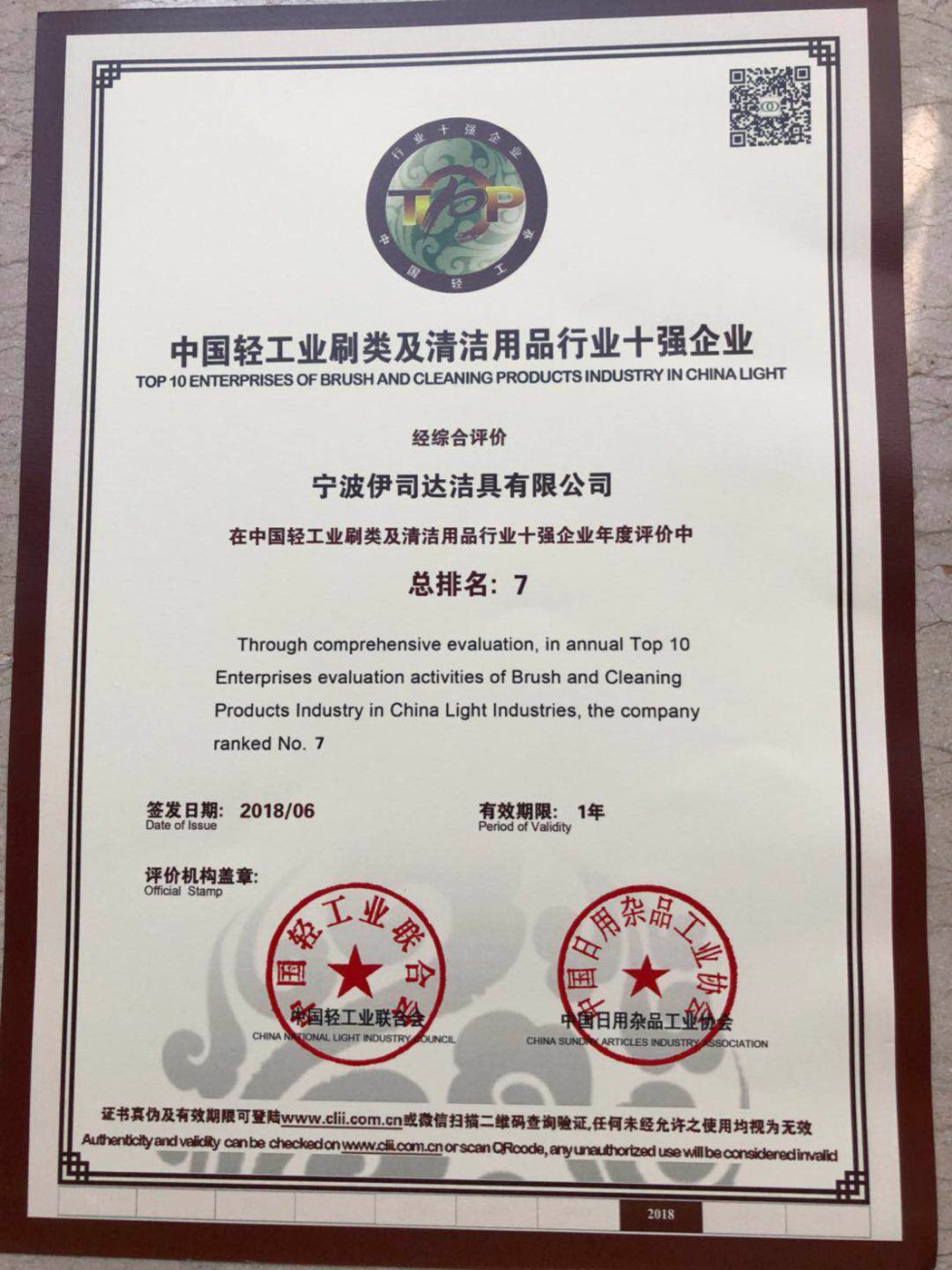 2018年7月9日,中國輕工業(yè)及清潔用品行業(yè)十強企業(yè)榜單在廣州揭曉,寧波伊司達潔具有限公司位列榜單,在輕工行業(yè)中競爭力優(yōu)勢明顯。