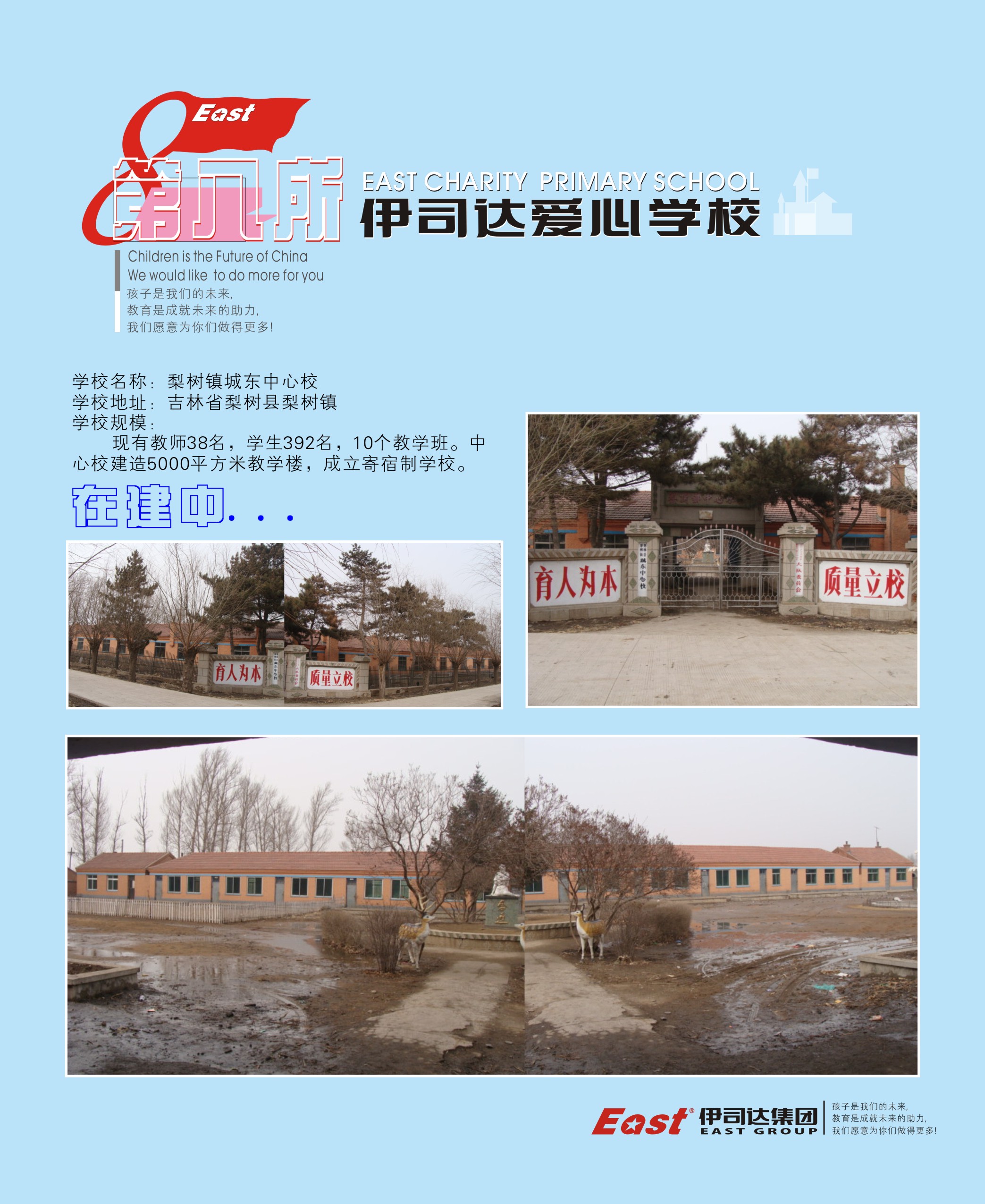 吉林梨樹縣梨樹鎮城東中心校,現有教室38名,學生392名,10個教學班,中心校建造5000平方米教學樓,成立寄宿制學校。