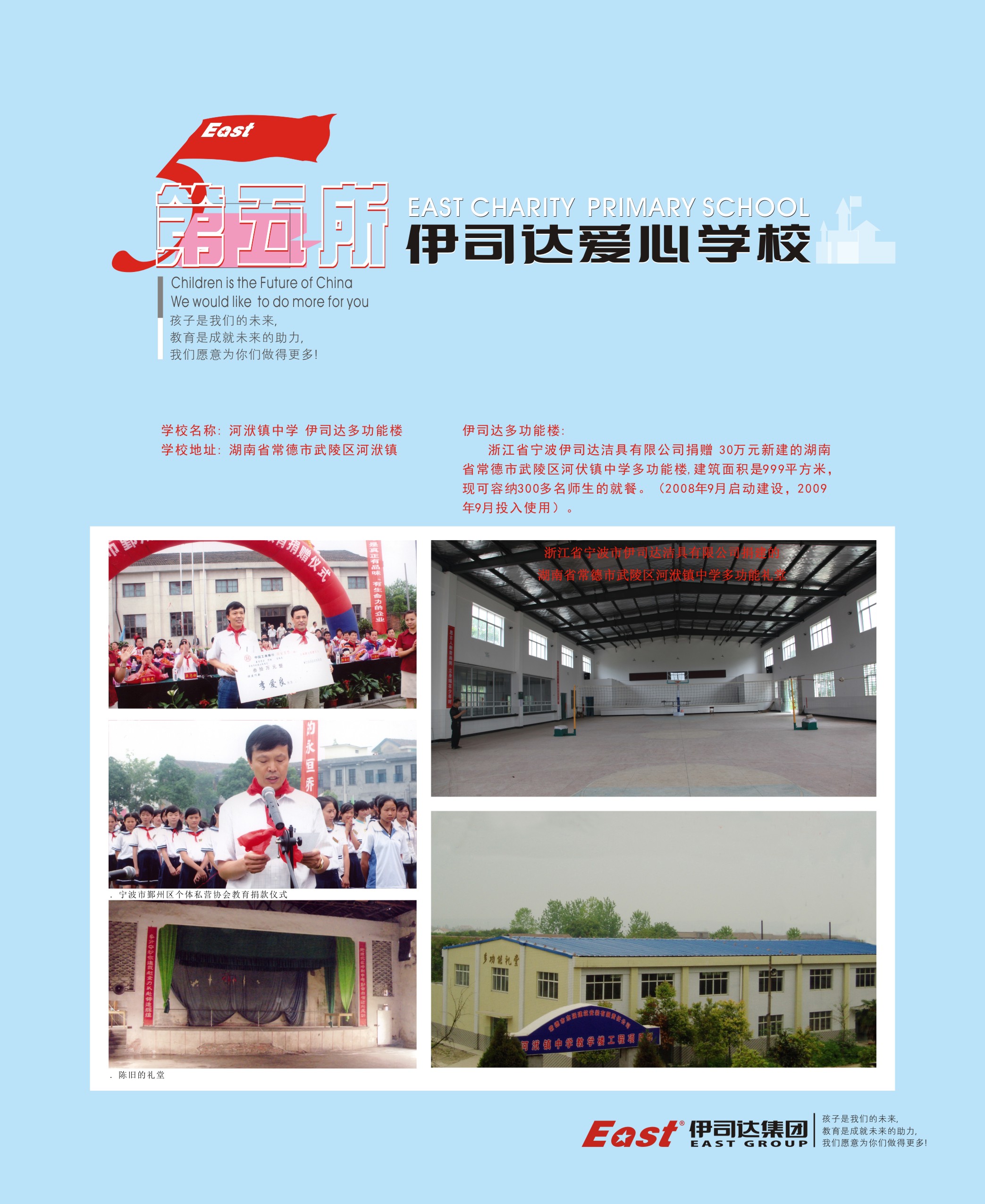 寧波伊司達潔具有限公司捐贈人民幣30萬元 新建的湖南省常德市武陵區河伏鎮中學多功能樓,建筑面積999平方米,可容納300多名師生的就餐。