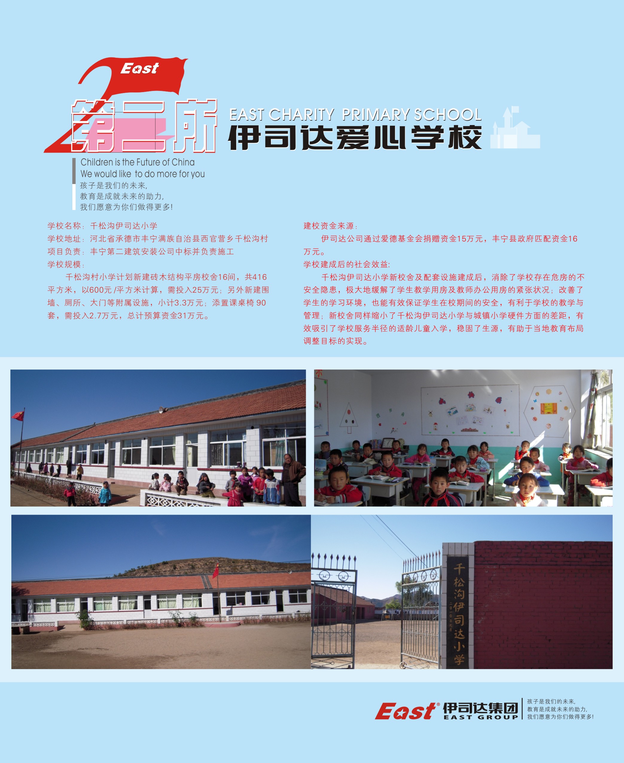 寧波伊司達潔具有限公司通過愛德基金會捐贈資金15萬元,豐寧縣政府匹配資金16萬元,重建千松溝小學,學校新校舍以及配套設施建成后,消除了學校存在危房的不安全隱患,極大的緩解了學生用房及教師辦公用房的緊張狀況。