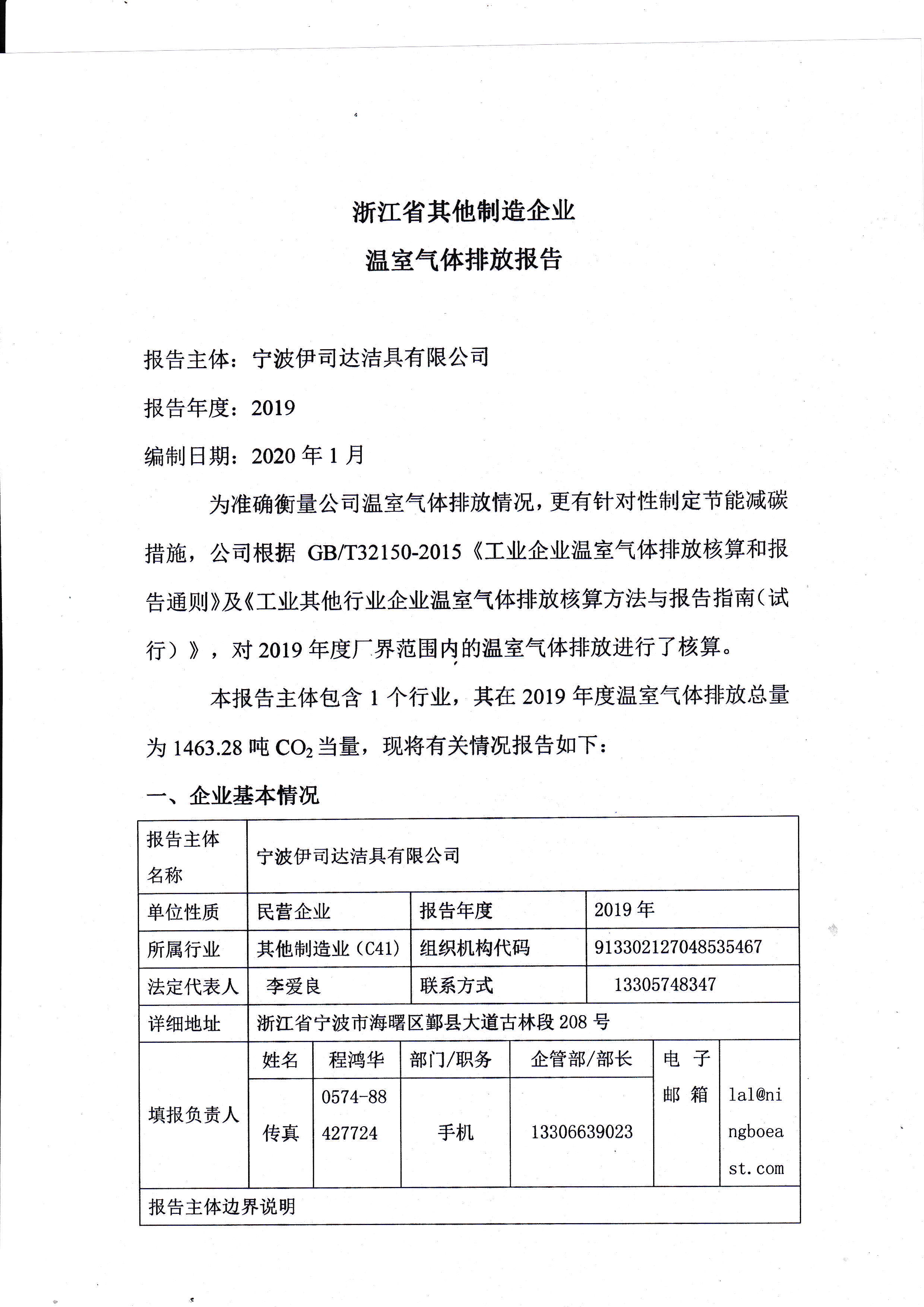 宁波伊司达洁具2019年度温室气体排放报告